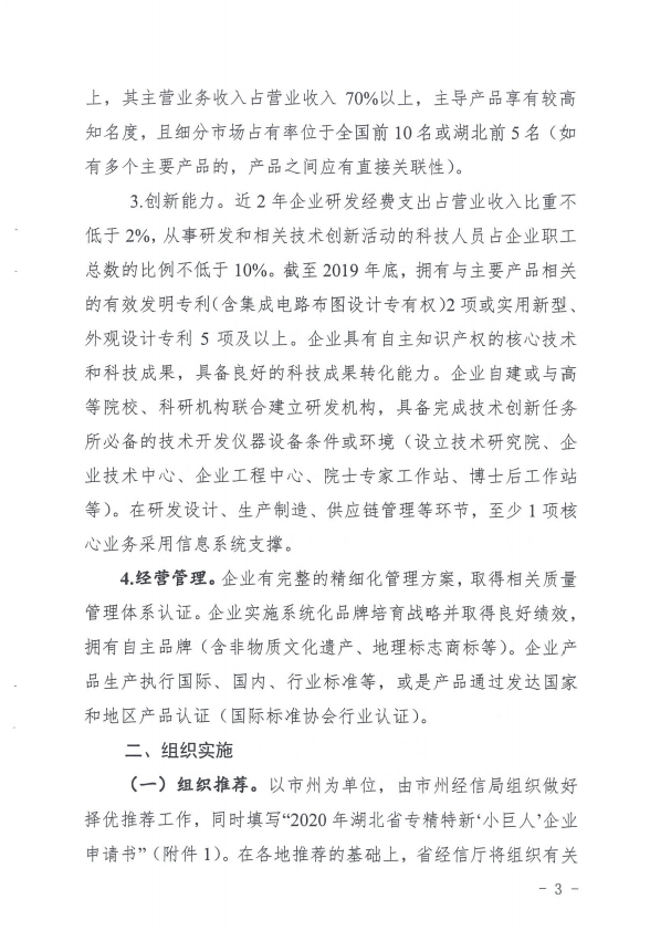 關(guān)于組織申報(bào)2020年湖北省專精特新“小巨人”企業(yè)的通知