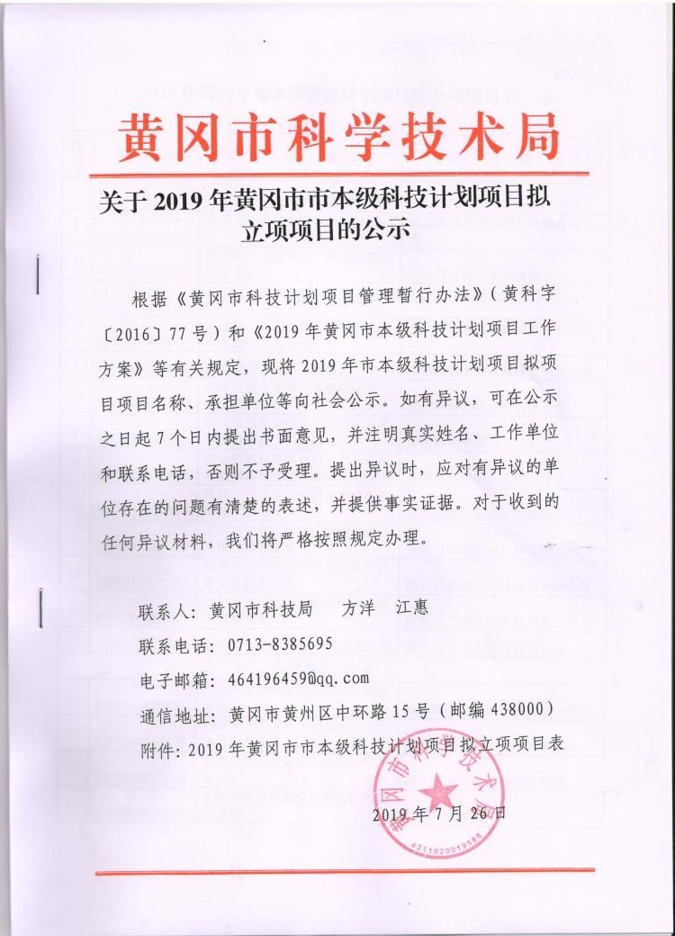 關(guān)于2019年黃岡市市本級(jí)科技計(jì)劃項(xiàng)目擬立項(xiàng)項(xiàng)目的公示
